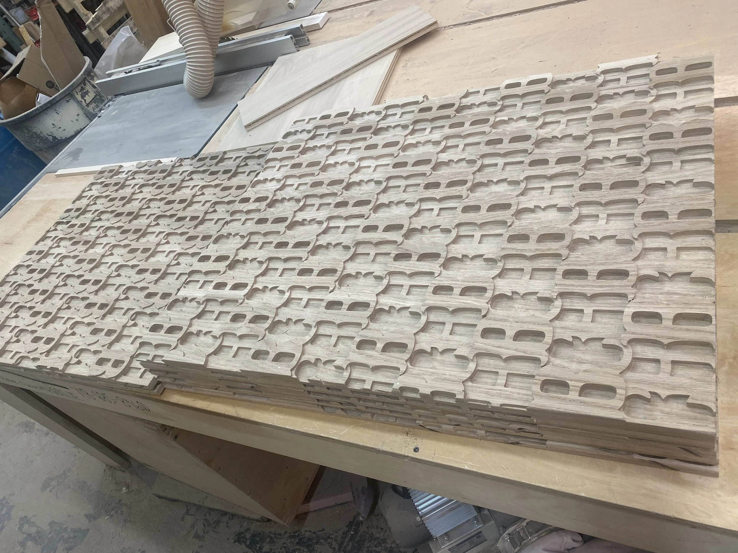 Designed and CNC carved the intricate panels for the giant door to the Brooklyn Chop House location in Times Square, NYC. The doors were made of oak, which was then dyed black and sealed.